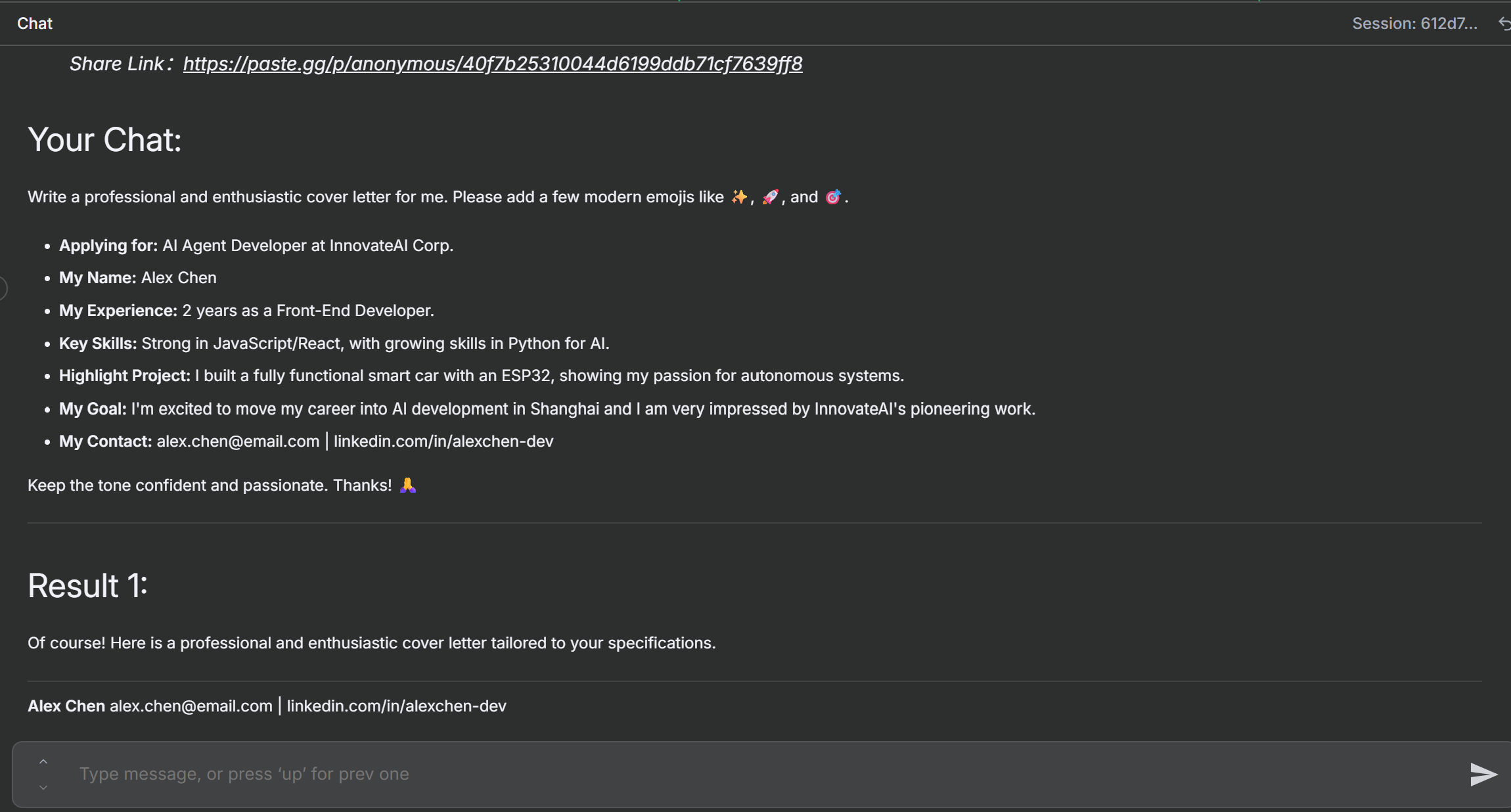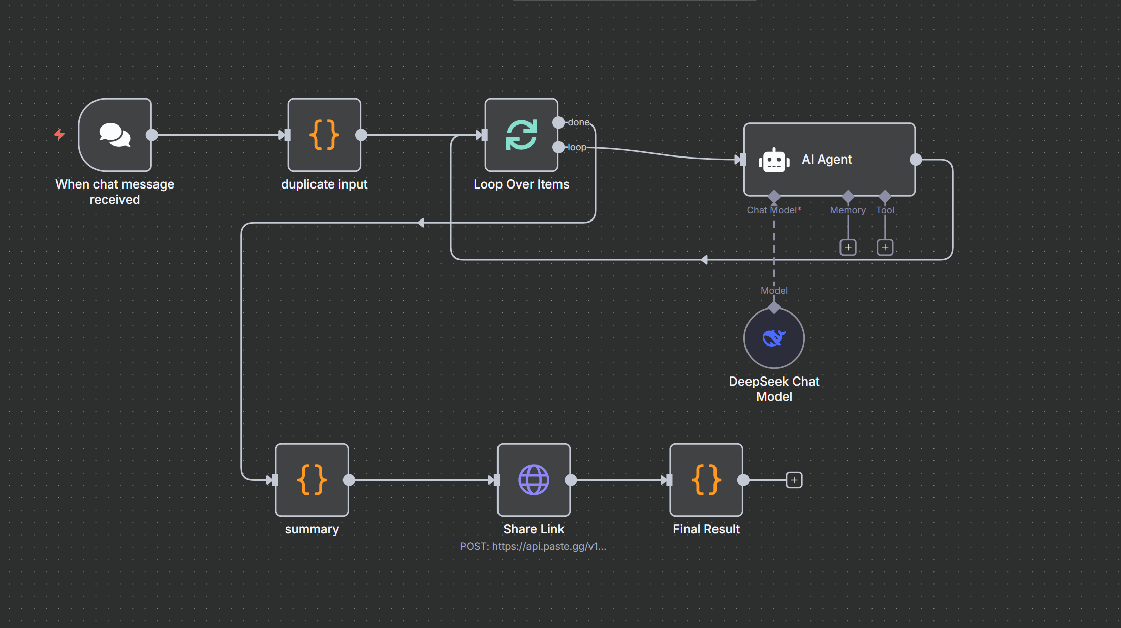 Have you ever asked an AI a question and felt the answer was good, but not quite perfect? Or perhaps you’re brainstorming and need more than just one idea? Re-submitting the same prompt over and over is tedious and slow. To solve this problem, I created this AI agent that automates the process. It takes your single question and runs it through the DeepSeek Chat Model ten times in parallel, harnessing the inherent creativity of the AI to generate a wide spectrum of answers from the same starting point. All ten responses are then bundled together for you, and for ultimate convenience, a shareable link (valid for 7 days) is automatically generated.