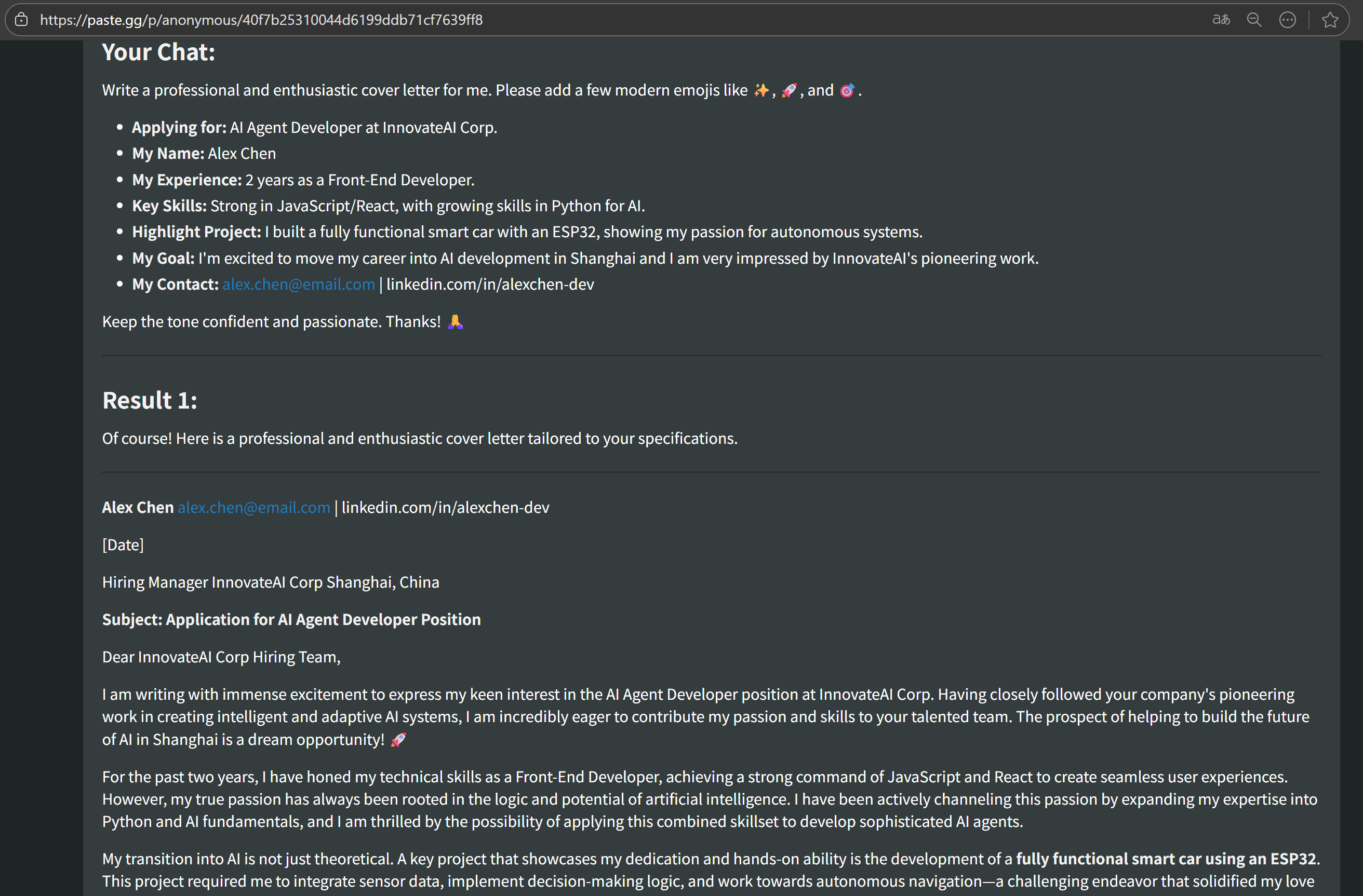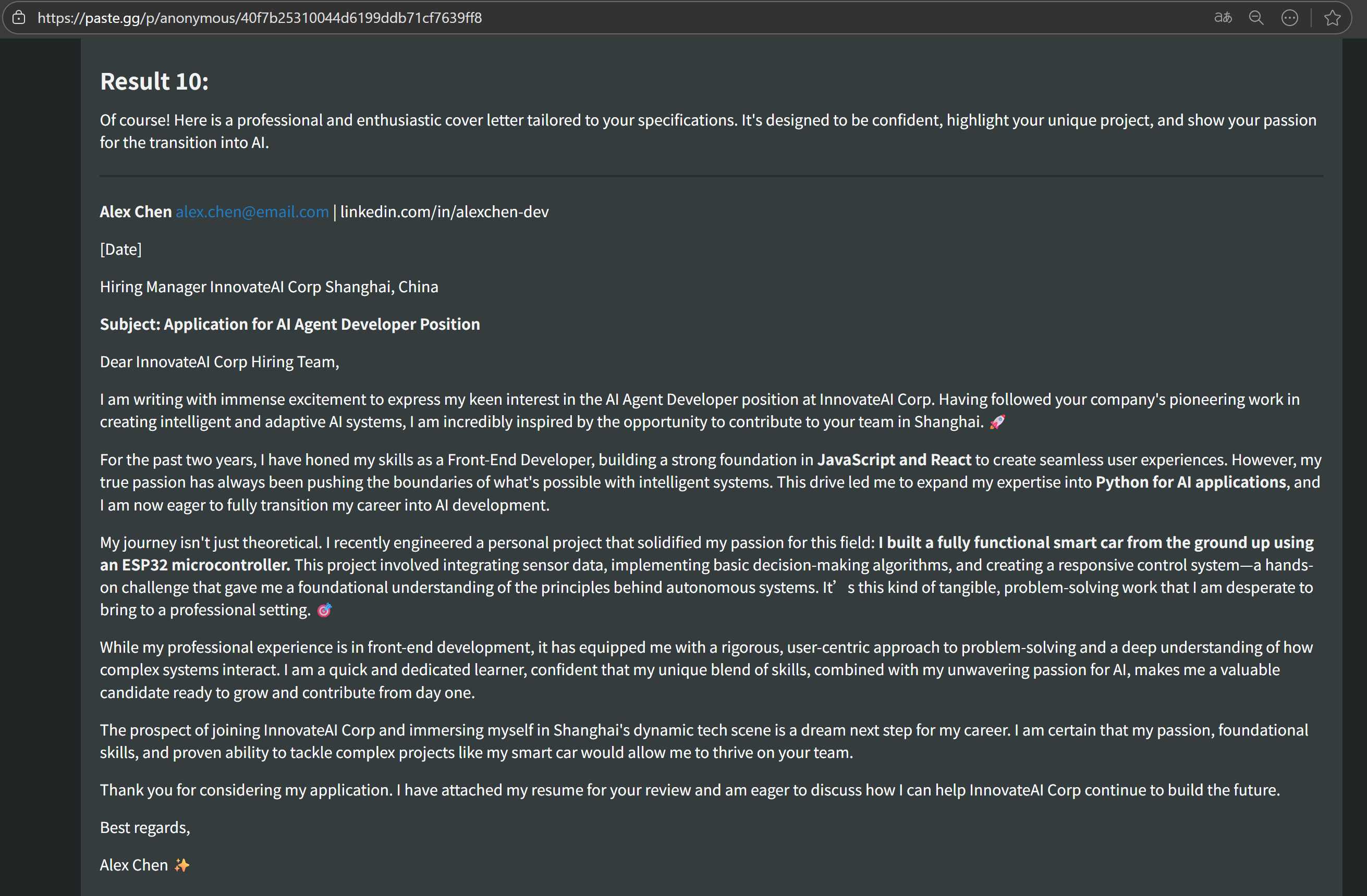 - Applying for: AI Agent Developer at InnovateAI Corp.